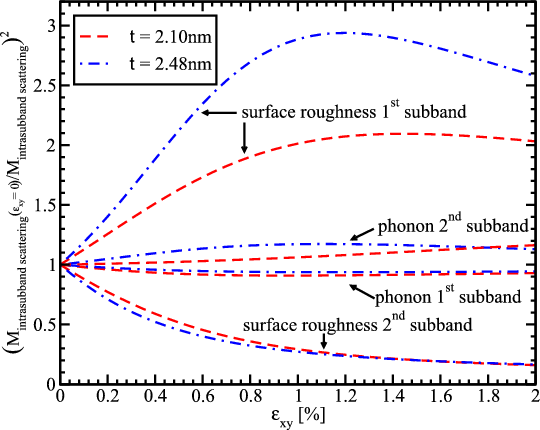 On the other hand, the surface roughness limited mobility for 2.1nm and 2.48nm thick films rises by about 200 and 300 percent, respectively, at around 1.2% shear strain and shows a slight decrease at strain values bigger than 1.2%. This behavior is dictated by the corresponding enhancement of the inverse surface roughness scattering matrix elements (Figure 6.10). The mobility enhancement shown in Figure 6.9b and their ratio shown in Figure 6.9a are consistent with the total mobility enhancement observed in Figure 6.7. Indeed, for the t=2.1nm film the unaccounted mobility enhancement is mostly due to the surface roughness limited mobility increase. Although the surface roughness limited mobility growths even stronger for t=2.48nm, the main contribution limiting the mobility is the phonon scattering. For this reason the whole mobility is slightly less enhanced as compared to that in the t=2.1nm film.
