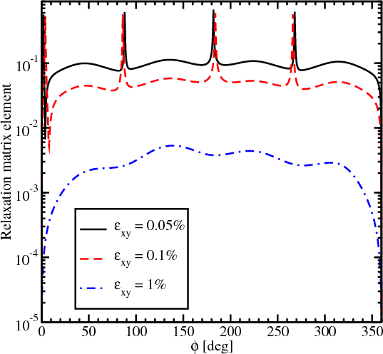 The splitting between the subbands depends on Dεxy - kxky∕M and their degeneracy is lifted by the kinetic-like term kxky∕M even without shear strain. This results in a strong dependence of the surface roughness induced spin relaxation matrix elements on the angle between the incident and outgoing wave vectors (Figure 7.1 and Figure 7.2). Figure 7.3 shows the dependences of the relaxation matrix elements on this angle for different values of shear strain. The sharp peaks in Figure 7.3 for shear strain values 0.05% and 0.1% nature of which were discussed for Figure 7.1 and Figure 7.2 are observed for similar angle values. However, the intersubband matrix relaxation elements for higher strain show lower values, except peaks. For the shear strain of 1% no peaks are observed and the matrix element values are smaller by several orders of magnitude. As follows from Figure 7.3, shear strain leads to the reduction of the spin relaxation matrix element.