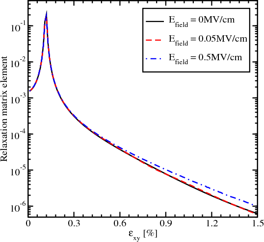 The dependence of the spin relaxation matrix elements on shear strain for several values of the electric field is shown in Figure 7.6. The spin relaxation matrix elements increase until the strain value 0.116%, the point determined by the spin hot spot condition. Applying strain larger than 0.116% suppresses the spin relaxation significantly, for all values of the electric field. In contrary to the scattering matrix elements (Figure 7.4 and Figure 7.5), the relaxation matrix elements demonstrate a sharp feature only for the shear strain value of 0.116% at zero electric field. Large electric field leads to an increase of the relaxation matrix elements due to the additional field-induced confinement resulting in higher values of the surface roughness induced spin relaxation matrix elements.