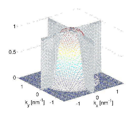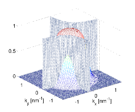 In Figure 7.20 and Figure 7.21 the dispersion of the first primed subband in films with thicknesses of 2.1nm and 5nm, respectively, is compared. The minimum energy of the subband is located at the point kz = k0, ky = 0, and its value for an infinite potential square well is determined by