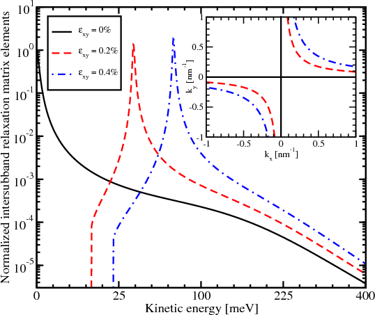Figure 7.10 demonstrates that the main contribution to spin relaxation comes from the intersubband processes due to the presence of the spin hot spots characterized by the sharp peaks of the intersubband spin relaxation matrix elements. Their position is shown in Figure 7.11. For higher shear strain values the hot spots are pushed to higher energies, away from the subband minima (inset in Figure 7.11). This results in a strong increase of the spin lifetime with shear strain for surface roughness and the phonon mechanisms as shown in Figure 7.12.