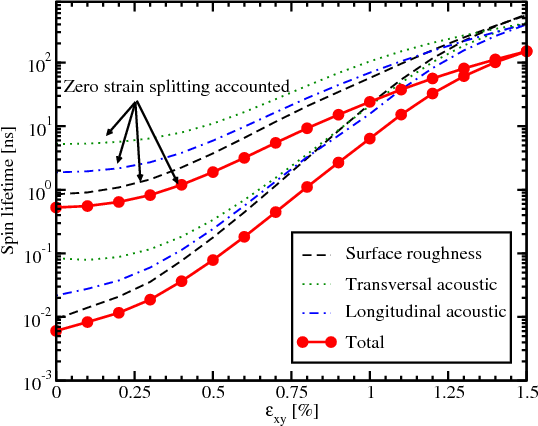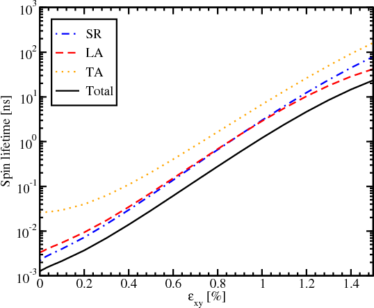Figure 7.23 and Figure 7.24 show the total spin lifetime and contributions due to acoustic, optical phonons, and surface roughness as a function of strain for two different thicknesses (3nm and 4nm). For the film of 3nm thickness the contribution due to longitudinal acoustic phonons (LA) is close to the contribution from surface roughness for small shear strain values. Further increase of strain makes LA phonons the main contributors to the total spin lifetime. For the thicker film shown in Figure 7.24 the total spin lifetime mainly follows the same trend as the longitudinal acoustic phonons spin relaxation. Interestingly, the intersubband optical phonons calculated as g-process can be safely ignored for the film of 3nm thickness, while their contribution for the film of 4nm thickness is more considerable. The dependence of g-process phonons on strain is not so significant as the surface roughness, intrasubband scattering, and f-process scattering. Thus, for thicker films the effect of several orders of magnitude increase of spin lifetime in strained films should not be observed.