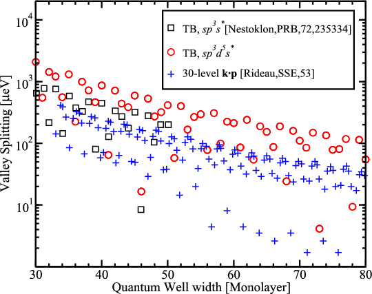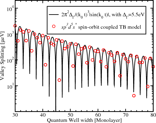 The [001] equivalent valley coupling through the Γ-point results in a subband splitting in confined electron structures [5]. The values of the valley splitting obtained from a 30-band k⋅p model [97], an atomistic tight-binding model [82], and sp3d5s* code are shown in Figure 7.13. Although looking irregular, the results follow a certain law. Figure 7.14 demonstrates a good agreement of the results of the tight-binding calculations with the analytical expression for the subband splitting [111]