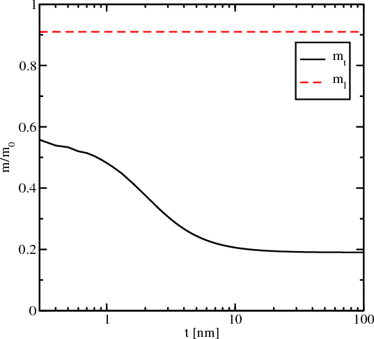 The dependence of the longitudinal and transversal effective masses on the well thickness is shown in Figure 7.22. The longitudinal effective mass ml = 0.91m0 does not depend on the thickness. In sharp contrast, the effective mass mt shows a strong increase as the film thickness reduces, in agreement with earlier predictions [111].