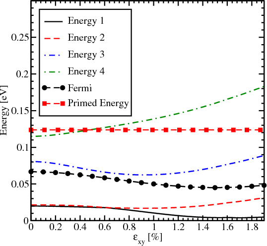 The dependence of energies for primed and unprimed subbands on strain for kx = 0 and ky = 0 together with the Fermi energy is shown in Figure 7.25 and Figure 7.26 for 3nm and 4nm, respectively. Energy 1 and Energy 2 stand for the lowest subbands of the two opposite valleys along [001] direction. Energy 3 and Energy 4 stand for the second unprimed subbands. The increasing importance of the g-process shown in Figure 7.24 compared to Figure 7.23 comes from the fact that the distance between the Fermi energy and the lowest energy in the primed subband decreases with thickness increasing. The occupation of the second subband become less pronounced at high strain as is confirmed by the Fermi level dependence for both thickness values (Figure 7.25 and Figure 7.26).