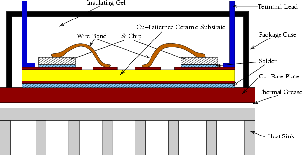 High-power requirements (currents from 100A to 2000A and voltages up to 3000V) can be implemented with standard power modules using conventional system designs. In general integration of standard power modules is restricted to parallel construction of IGBT (or power MOSFET) dies in order to increase the current rating including free-wheeling diodes. There is no control or protection circuitry inside the modules. These modules use classical assembly technologies like solder mount on the backside of the die and ultrasonic bonding of aluminum wires for the top side contacts. They are limited in terms of reliability, thermal performance, and voltage performance (blocking voltage and insulation voltage of the overall module). As an example of the reliability requirements in railway traction applications these modules will have to ensure about 10 million power cycles during their life time. One can see serious thermal fatigue in the modules, which is due to the stress on the solder resulting from the use of different materials which expand and contract at different rates during the thermal cycle. The bonding wires which are connected to the aluminum metalization on the top side of the power device are particularly sensitive to the thermal cycling. Innovative package design using new materials such as aluminum nitride (AlN) or silicon nitride (SiN) ceramics can enhance the thermal capabilities and reliability of high-power modules. Improvements in high-voltage IGBTs, with a new structure design such as trench IGBTs, can also give better electrical characteristics.