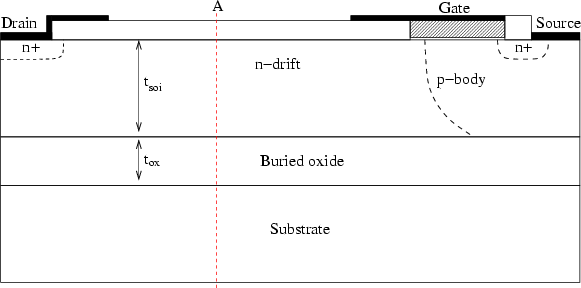 The breakdown voltage of conventional high-voltage SOI devices is limited by the buried oxide thickness, SOI thickness, and the drift layer length. Most of the voltage is supported by the buried oxide layer. The maximum electric field strength at the interface between silicon and the buried oxide is limited by that of the silicon region at the interface. To obtain a higher voltage, the buried oxide and the SOI thickness must be increased, or SOI thickness must be decreased from the certain critical values depending on the buried oxide thickness. With the substrate at the ground potential, the breakdown voltage of SOI can be expressed as [1]: