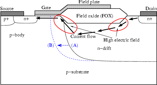 injected into the gate oxide. For high-voltage LDMOSFETs a high electric field