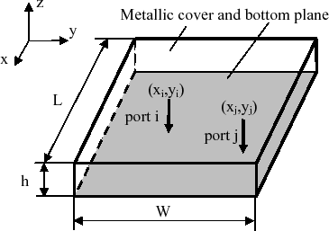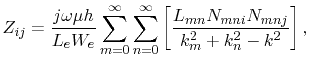 h}{L_{e}W_{e}}\sum_{m=0}^{\infty}\sum_{n=0}^{\infty}\left[\frac{L_{mn}N_{mni}N_{mnj}}{{k_{m}^2+k_{n}^2-k^2}}