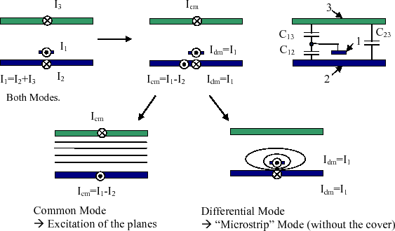The conductor with number 1 in Figure 5.3 is the trace, the ground plane is assigned to number 2 and the cover plane to number 3. The partial capacitances between these conductors are indexed accordingly. A source which drives the traces against the ground plane will excite both, the differential mode and the common mode currents. The partial capacitance between the cover and the ground plane
