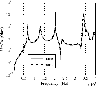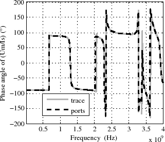Transfer impedance from the trace source current to the slot measurement port at (67mm,104mm). Comparison of HFSS results from a model with a trace (Figure 5.7(b)) to the results obtained with (5.6), (5.9) and a HFSS model with ports.