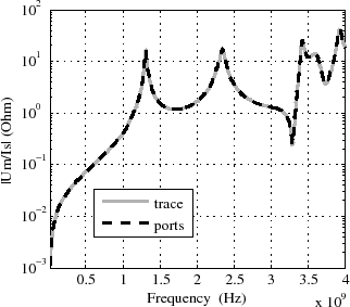 Transfer impedance from the trace source current to the slot measurement port at (67mm,104mm). Comparison of HFSS results from a model with a trace (Figure 5.7(a)) to the results obtained with (5.6), (5.9) and a HFSS model with ports.