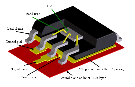 | Current flow path on the PCB, the IC package, and the die. The vertical current segments are on the pins of the leadframe and on the bond wires. The dotted current arrows indicate that the current is flowing on the lower side of the lead frame pins, according to a shorter current loop. |