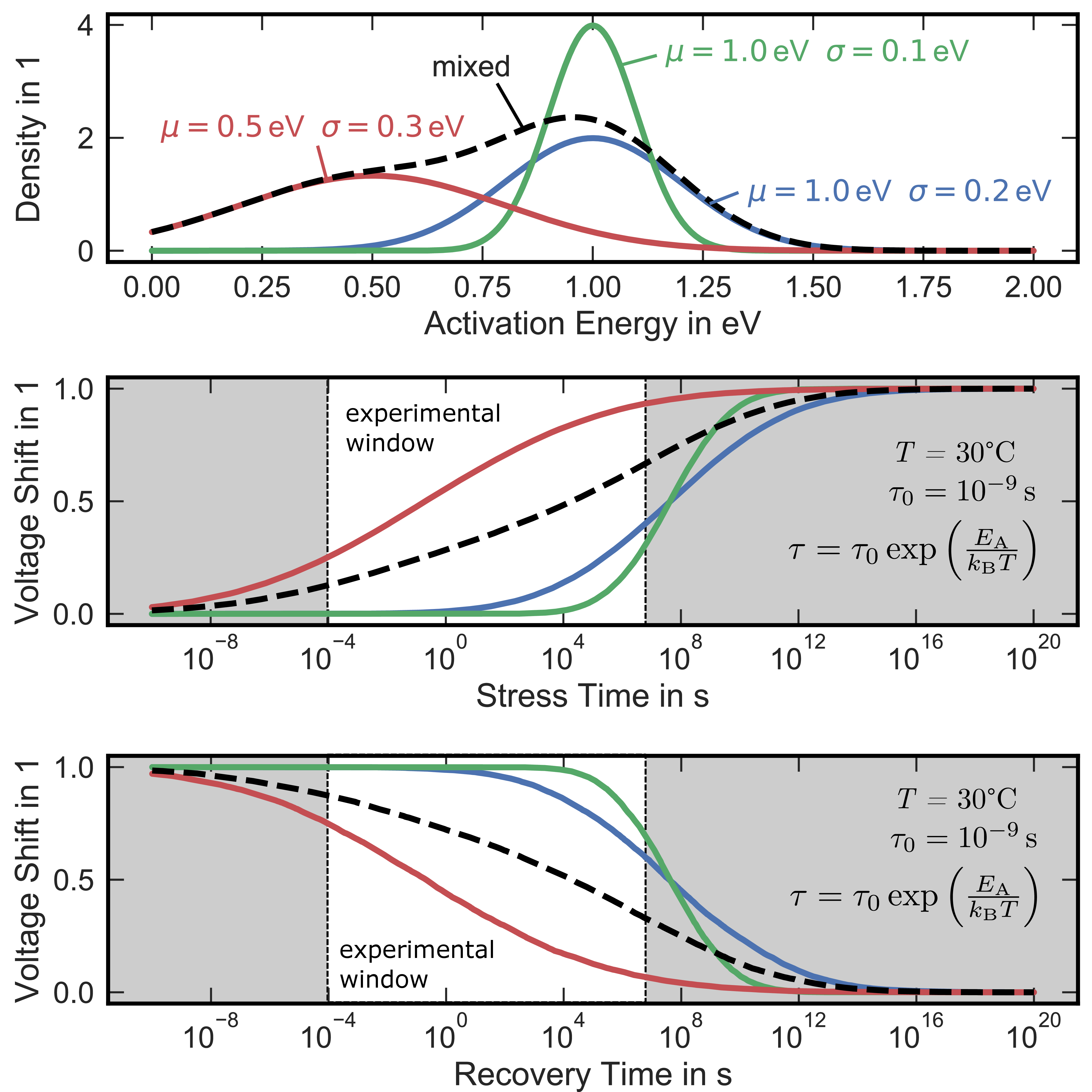 The influence of distributed activation energies on the observed voltage shift during stress and recovery is shown in Fig. 1.7. For instance, a normally distributed