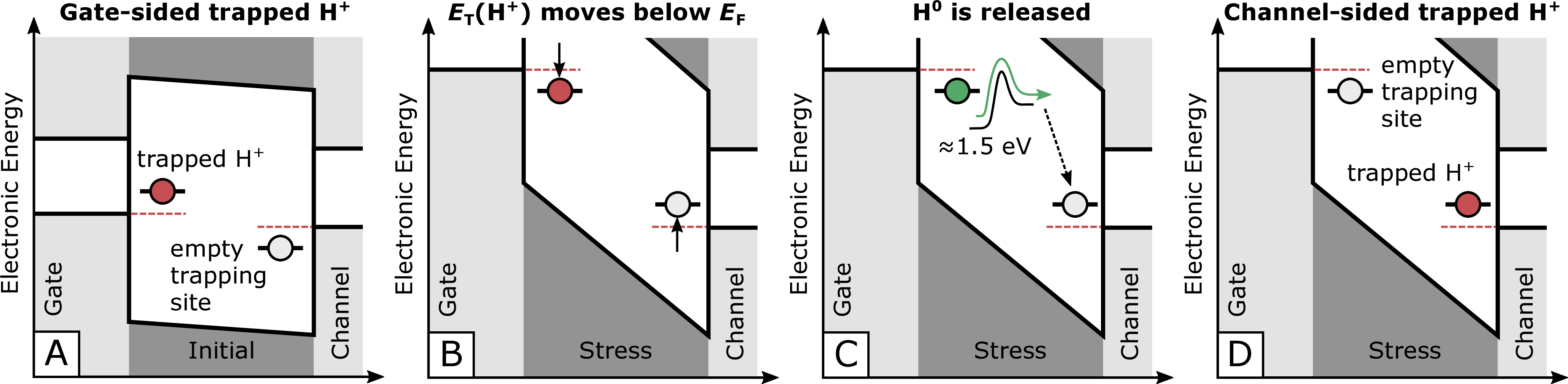 oxide layer close to the gate electrode (A) may become neutralized if a gate potential is applied and the Fermi-level moves below the energy level of the trapped (B). The neutrally charged hydrogen can now be released from the