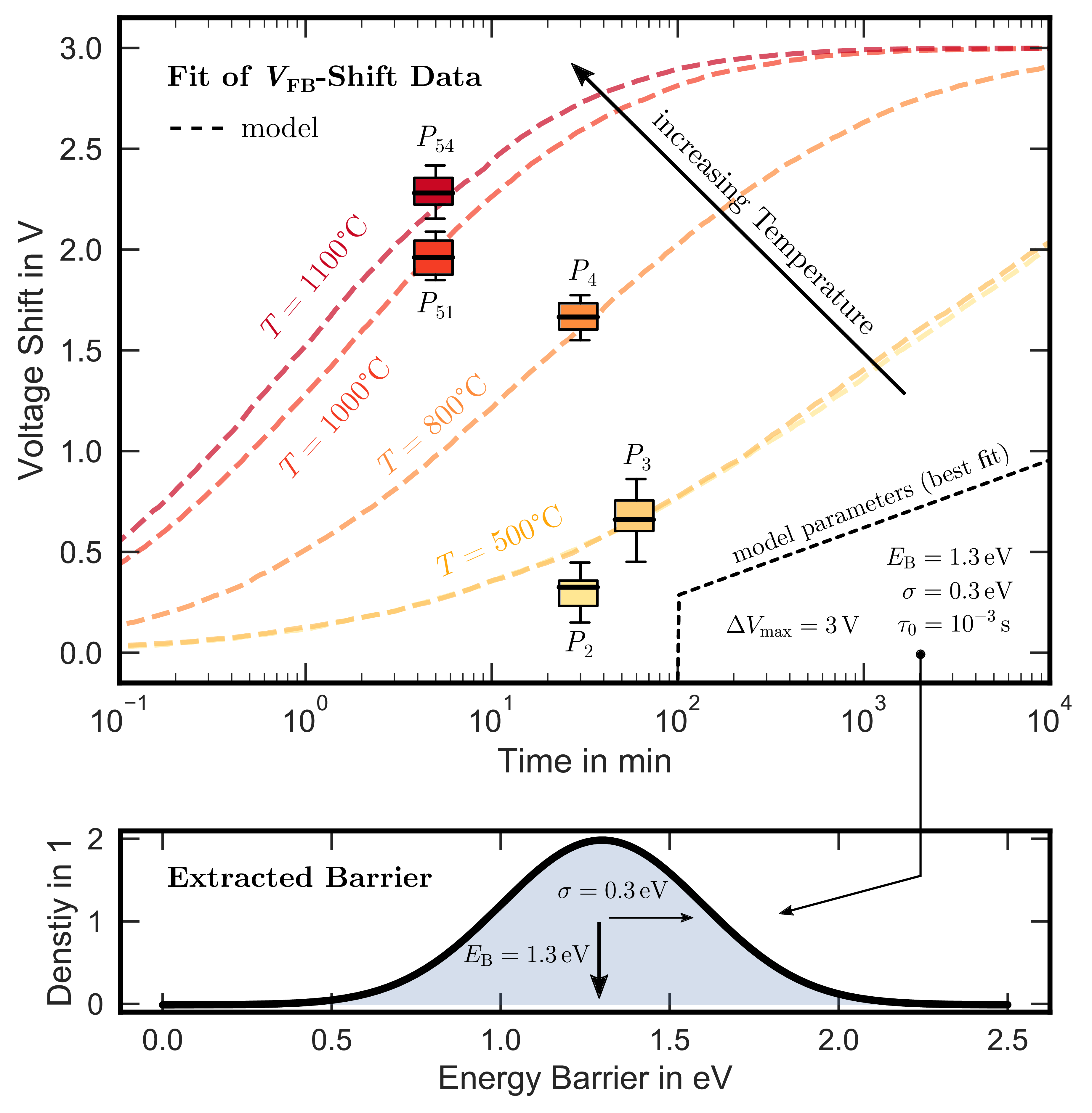 Fig. 4.11 shows a fit of the data from Fig. 4.3 for the barrier extraction. The boxes represent the flat band voltage shift