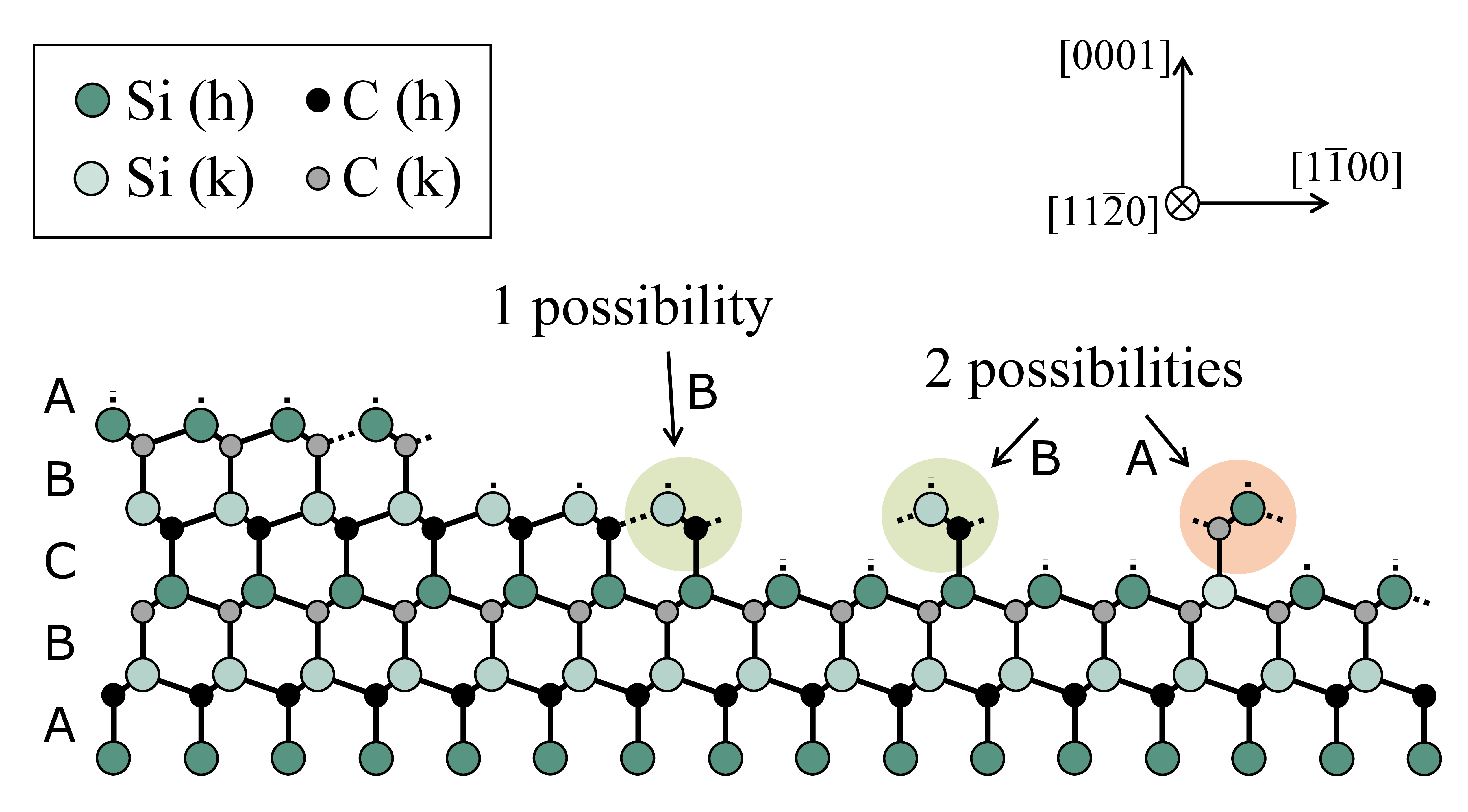The main reason for the off-axis cut of the SiC wafers is to enable polytype preservation during the high-quality homoepitaxial growth process [6, 11] as indicated in Fig. 1.4. Without an off-axis wafer cut, all stacking information of the polytype is lost and two arrangements, A or B, are possible for the atomic bilayer, which follows C. Due to