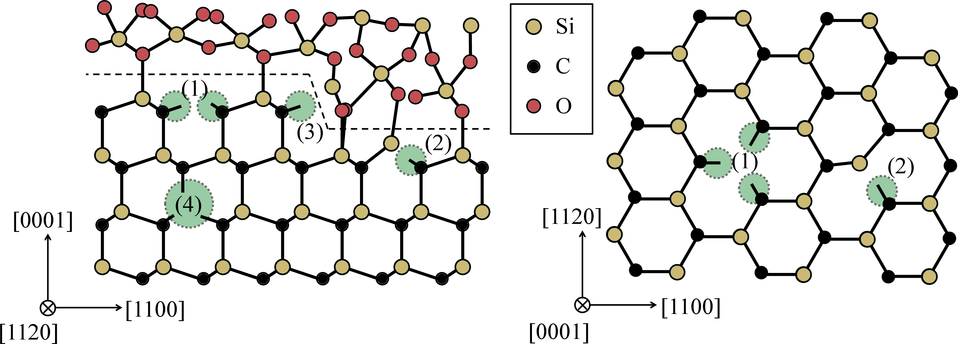 Figure 2.33: Schematic view of the silicon vacancy (VSi) and the PbC that were considered for comparison with the EDMR measurements [5, 119]. 1) VSi on a terrace, 2) PbC at a terrace, 3) PbC on a step edge, 4) VSi in the layer beneath the interface. Left: view along the [1120]-direction. Right: view along the [0001]-direction [5].