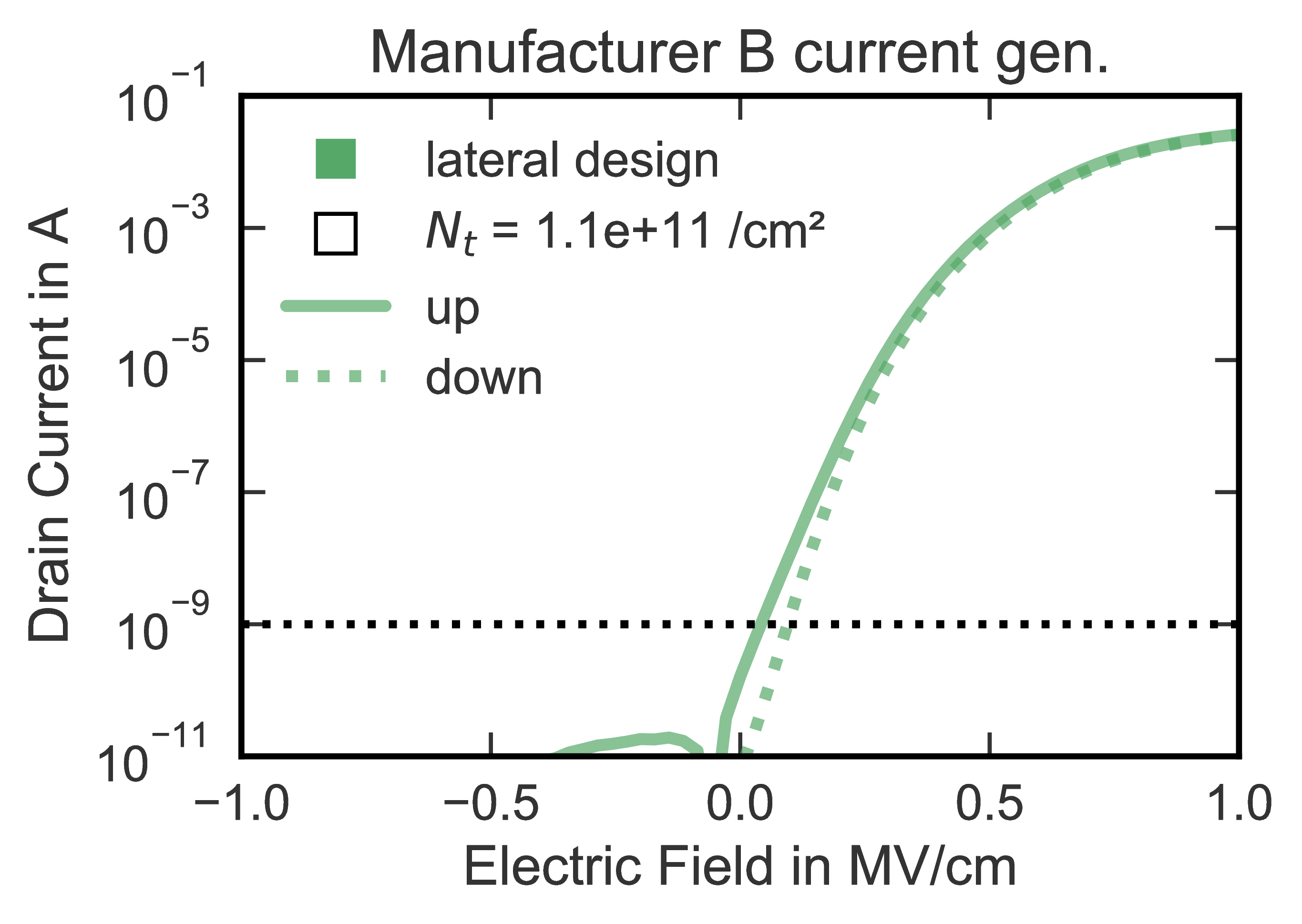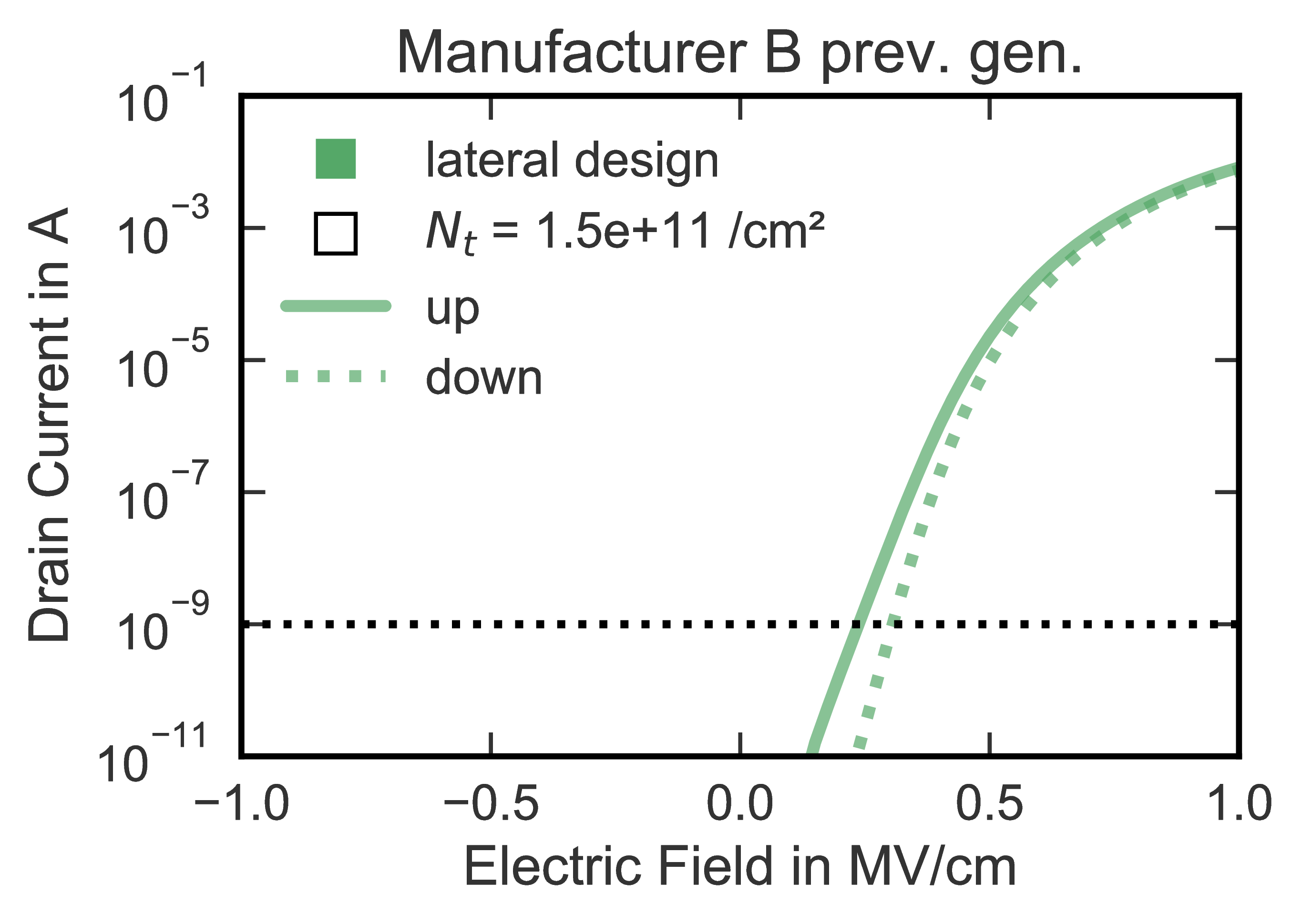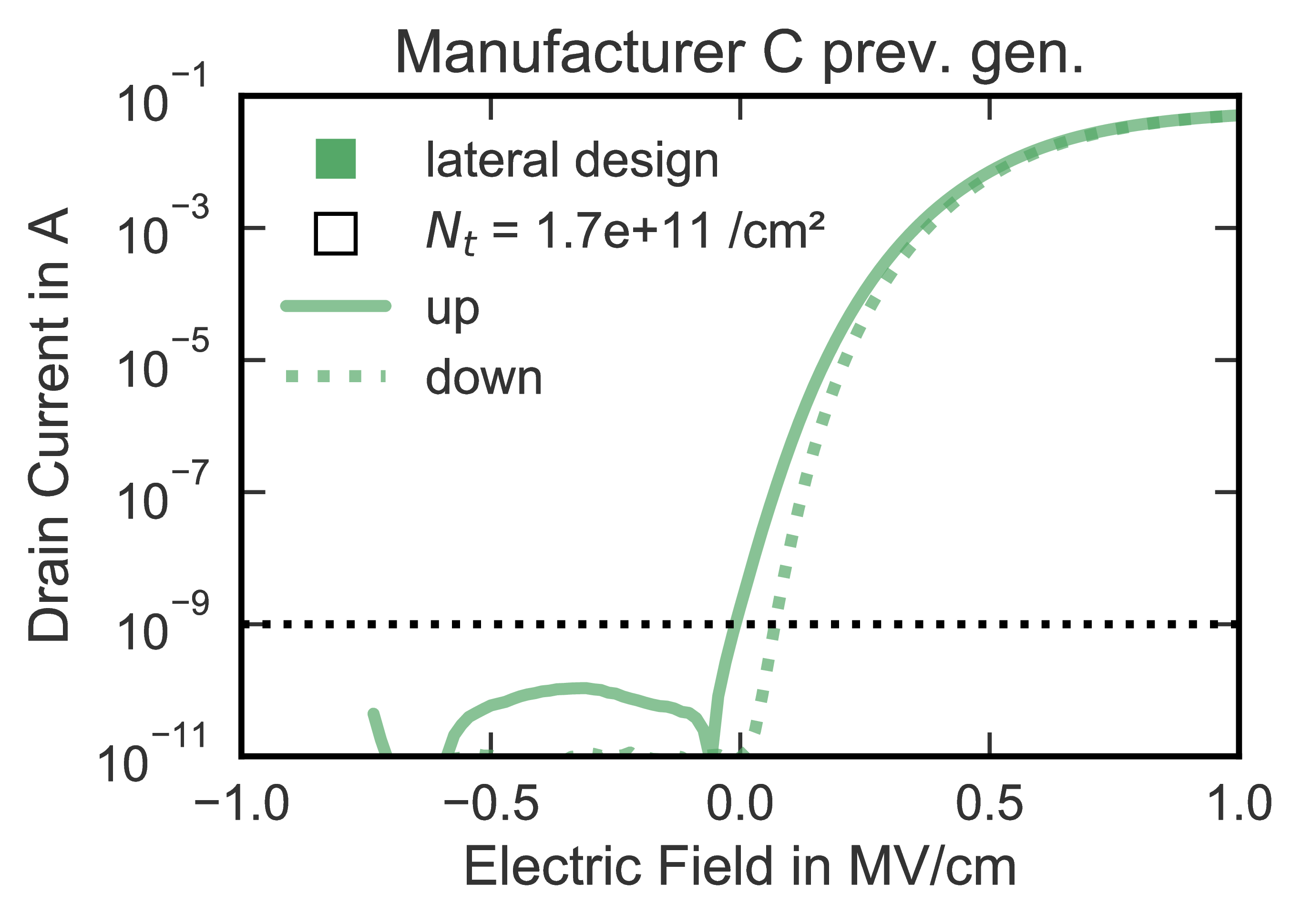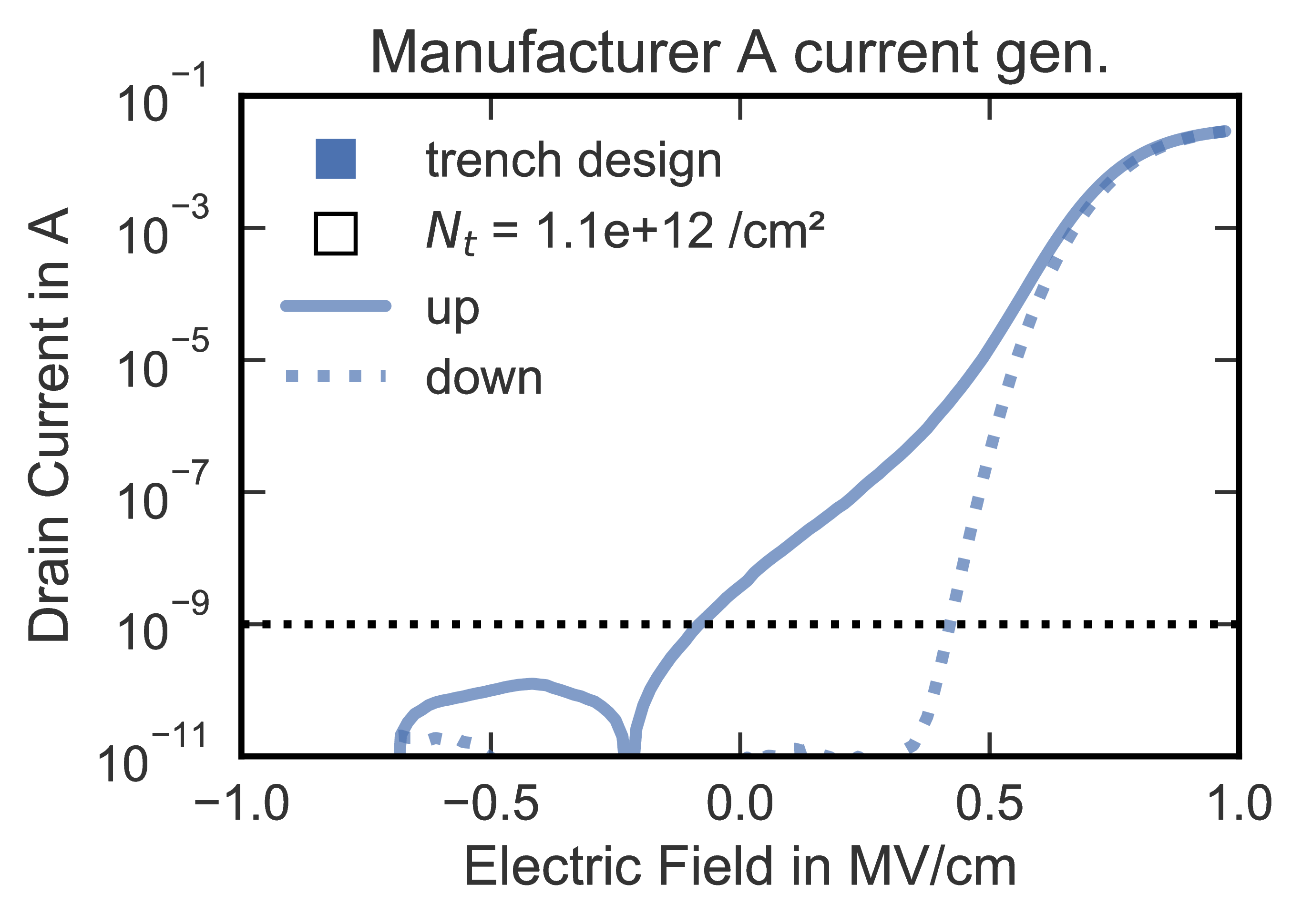 -axis (trench design) are indicated in blue. Trench devices show an increased hysteresis