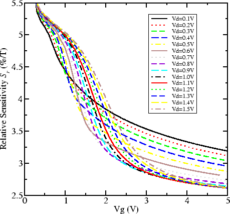 This behavior is more visible, if the relative sensitivity is plotted as a function of the drain voltage. Figure 4.9 shows this plot for different gate voltages. The minima of the relative sensitivity versus the drain voltage indicate the transition between diffusion and drift carrier transport, showing the complexity of the electro-magnetic interaction. In the low temperature analysis some surprising results are found for the same bias conditions, cf. Section 4.3.