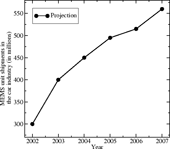 All of the above steps impact the design cycle of any integrated sensor. Monolithic integration of sensors is of great interest for the microelectronics industry, because it will provide cheap and reliable sensors [15]. According to In-Stat/SMR 1.1, despite the growing demand of the car industry (see Figure 1.2), to date, only a few sensor devices have been integrated into a high-volume production IC process.