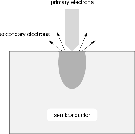 During an AVC measurement a beam of high energy primary electrons is focused on the surface of a cross-sectioned semiconductor device. Typical electron beam energies are of the order of several keV and the beam diameter is of the order of several 10 nm. The injected electrons generate a high number of secondary electron-hole pairs by impact ionization. A fraction of the secondary electrons has enough energy to leave the semiconductor (see Fig. 2.2) and their kinetic energy can be measured. From the kinetic energy information regarding the net doping can be extracted. By scanning the electron beam across the semiconductor surface the two-dimensional doping distribution is probed.