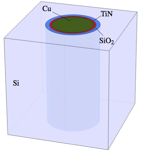In 1.7, the general design of a TSV is shown as a cylinder of conducting material which is electrically isolated from the silicon wafer by an isolation layer, typically made of silicon dioxide (SiO2) and called TSV liner, surrounding the TSV conductor [84].