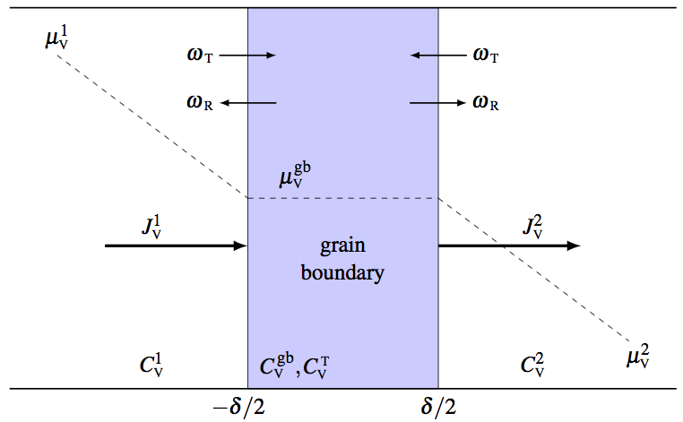where Jv2 and Jv1 are the normal components of the flux from both sides of the grain boundary( (3.2)). The second term on the right hand side of equation (3.35) represents the recombination rate of vacancies at the grain boundary region due to the diffusing fluxes from/to the bulk. In the continuum modeling approach, the chemical potential on the grain boundary (equation (3.31)) is constant throughout the width δ, and is equal to the chemical potential in the bulk (equation (3.32)) at the interfaces between bulk material and grain boundary such that
