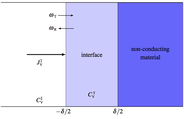 The vacancy dynamics in the presence of material interfaces can be described by using the same approach employed above for the grain boundary model. Typically, interfaces separate materials with different properties. Interfaces have higher diffusion coefficients than the bulk material, and act as sources/sinks for vacancies. If the interface separates a conducting material from a non-conducting one, the interface acts as a blocking boundary for vacancy transport from the metal line to the interface ( (3.3)). Furthermore, since there is no flux of vacancies due to electromigration in the non-conducting material, the flux term Jv2 in equation (3.37) vanishes. In this situation, equation (3.41) reduces to