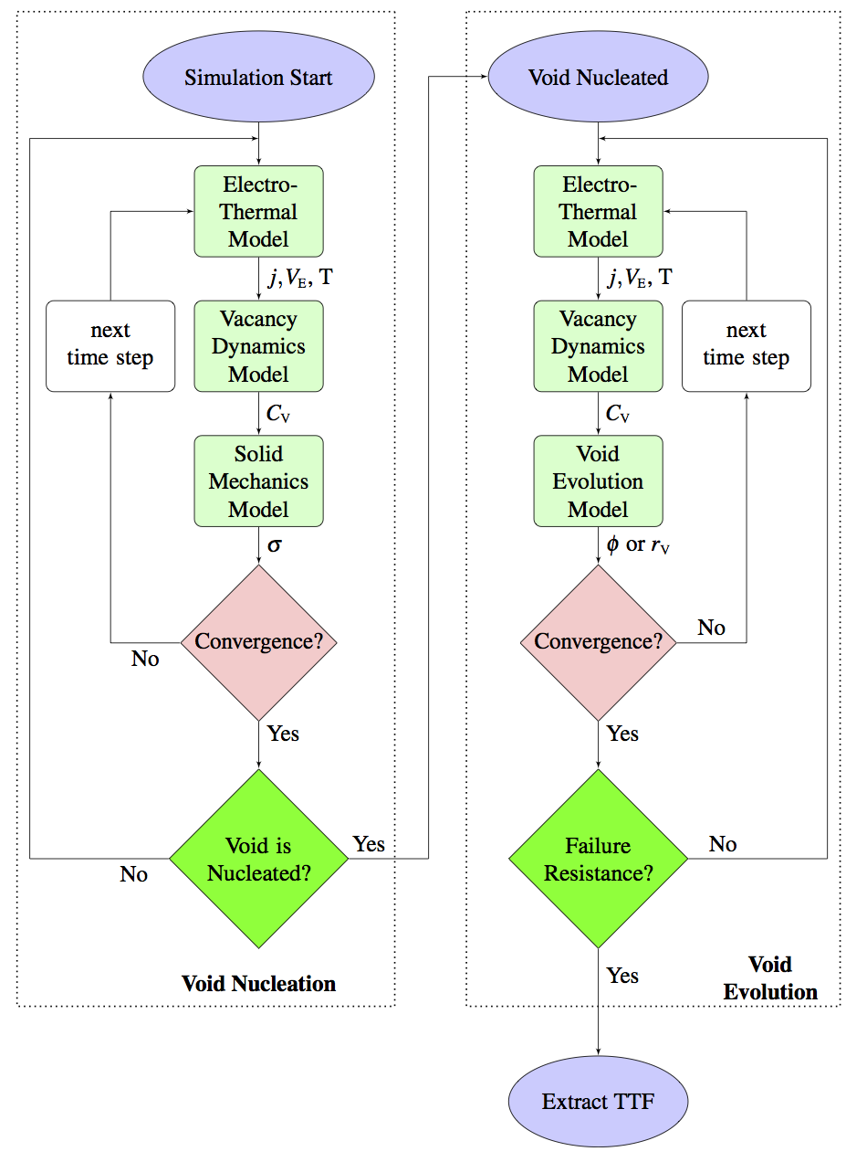 Since different physical effects are responsible for each phase of failure development, modeling and simulating electromigration by using FEM-based numerical calculations constitutes a multiphysics analysis which can be divided into the void nucleation phase and the void evolution phase, as depicted in the scheme presented in (4.6). In this way, the complete electromigration time-to-failure (TTF) estimation is obtained by summing the void nucleation time and the void evolution time. The contribution of each component in the electromigration lifetime evaluation depends on different kinetic and physical effects. The modeling of each phase of failure development is necessary for a more precise lifetime prediction and for a better understanding of their impact on the electromigration failure mechanism.