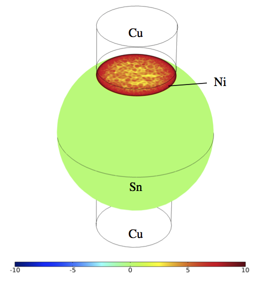As discussed before, the nucleation of a void is related to the formation and growth of the IMC at the interface between the UBM layer and the Sn bump. Other authors have demonstrated that the growth of an IMC inside the bump under the influence of electromigration is mainly caused by the atomic fluxes of the different materials composing the geometry (JCu, JNi, and JSn), which are driven by gradients of the chemical potentials (μCu, μNi, and μSn) and the electromigration force [31,30,110,111]. The Cu and Ni atoms penetrate into the Sn bump and segregate just below the UBM/bump contact surface. The dynamics of the subsequent IMC growth is determined by the chemical reactions which convert Cu, Ni, and Sn into an IMC, typically consisting of CuSn or NiSn. The model presented in [31,30] assumes that all the transport processes take place inside the Sn bump. During the formation of the IMC, the interaction between Cu, Ni, and Sn causes hydrostatic stress because of the resulting volume change. The accumulation of atoms may give rise to compressive stresses within the solder or at the solder/UBM interface and consequent hillock formation. In turn, at the specular side of the interface, vacancy accumulation would produce tensile stress and subsequent void nucleation. The hydrostatic stress distribution in the structure is monitored as can be seen in (5.12). A tensile stress increases from the center towards the periphery of the interface between the bump and the UBM layer, which leads one to the conclusion that a void most probably nucleates at the bump/UBM interface.