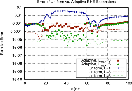 The number of unknowns obtained with uniform and three adaptive expansions are depicted in Fig. 6.10. Savings of a factor of almost three are obtained with the target quantity based scheme, which yields virtually the same accuracy as uniform expansions. Memory requirements and execution times are consequently reduced by the same factor. Typically, higher savings for the execution times are obtained in practice, because linear solvers with optimal complexity are not available in general. A combination of the three different schemes proposed may give slightly higher savings, which become significant at very high expansion orders only.