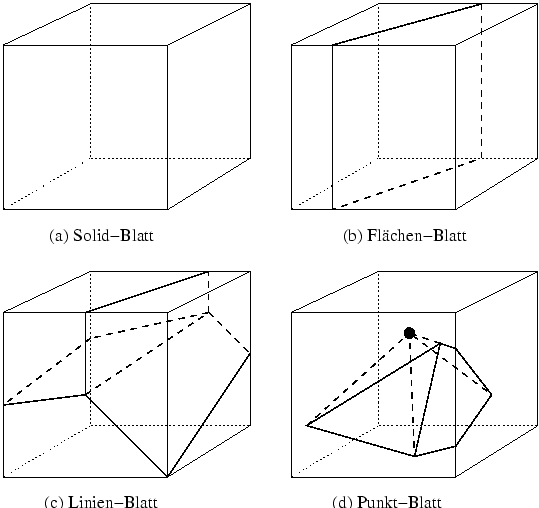 Mir einem erweiterten Octree (auch Finite Octree) [127] lassen sich nicht nur die Punkte, sondern auch die Linien, Flächen und Solids einer Struktur geometrisch ordnen. Er eignet sich deshalb zur Suche von Objekten in unstrukturierten Gittern oder BRep-Geometrien. Wie beim Punkt-Octree wird der Raum in Würfel eingeteilt, wobei jeder Würfel in acht Sub-Würfel aufgeteilt wird, bis ein Grenzkriterium erreicht wird. Abbildung 5.8 zeigt die vier möglichen Fälle, bei denen die Aufteilung abgebrochen wird, da ein weiteres Zerlegen des Würfels mindestens einen Sub-Würfel des selben Typs hätte. Einen Knoten, der nicht weiter zerteilt wird, nennt man Blatt.