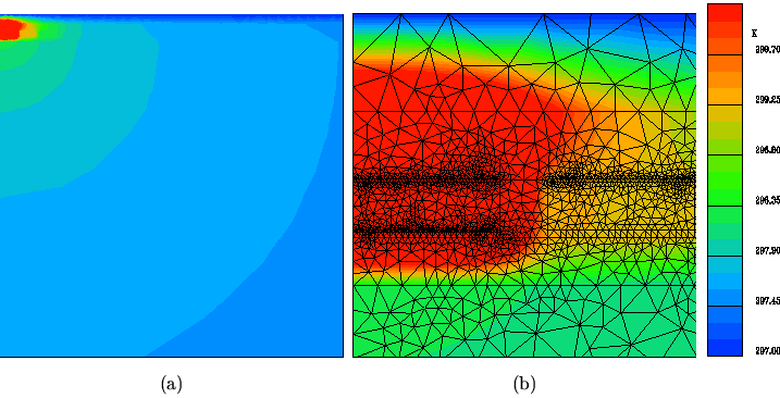 In Abb. 7.2 ist die Temperatur auf dem gesamten Simulationsgebiet dargestellt. Die (halbe) Al-Leitung befindet sich (kaum erkennbar) in der linken oberen Ecke. Man erkennt hier, dass die Erwämung weit in das Substrat hineinreicht und deshalb auch das Simulationsgebiet derartig groß gewählt werden musste. Würde man beispielweise die Abmessungen des Simulationsbereiches auf die Hälfte reduzieren, würde der untere Rand die 5%-Isothermenlinie schneiden und ein um etwa 5% größerer Simulationsfehler wäre zu erwarten.