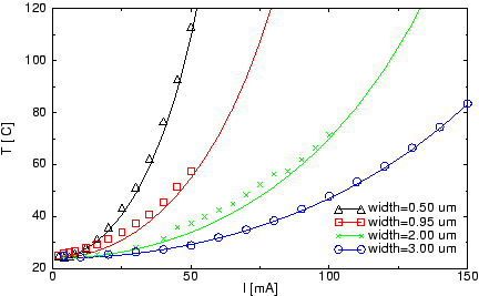 Die Oberfläche der Teststruktur ist direkt der Umgebungsluft ausgesetzt. In der Simulation ist eine solche Randbedingung schwierig zu modellieren, da in Gasen Konvektion als dominierender Wärmetransportmechanismus vorherrscht. Konvektion kommt entweder durch eine extern verursachte Luftströmung zustande (z.B. Gebläse) oder durch Erwärmung. Da im Experiment die Teststruktur keiner externen Luftströmung ausgesetzt und in waagrechter Position montiert ist, kann man davon ausgehen, dass die Luftbewegung an der Oberfläche sehr gering ist und deshalb vernachlässigt werden kann. Diese Annahme wird durch die Messdaten, die einen quadratischen Anstieg der Temperatur mit dem Strom aufweisen, bestätigt. Im Falle thermischer Konvektion müssten Abweichungen von diesem quadratischen Verlauf im oberen Temperaturbereich erkennbar werden, was hier nicht der Fall ist.
