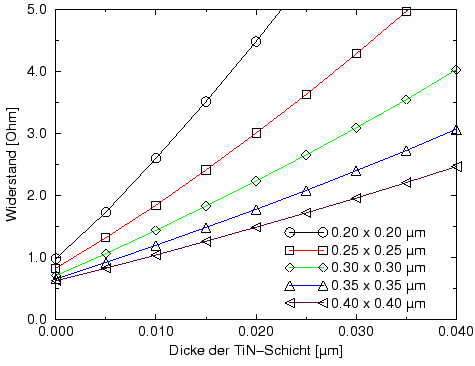 Ein Vergleich mit Messdaten [26] zeigt für den Fall einer [20]nm starken Barriereschicht einen um 30% höheren Widerstand als berechnet. Dieser erhöhte Messwert lässt vermuten, dass die Übergänge von Cu auf TiN einen zusätzlichen Widerstand bewirken. Bei Vias ohne einer TiN Barriere liegen die gemessenen und simulierten Werte nur wenige Prozent auseinander.