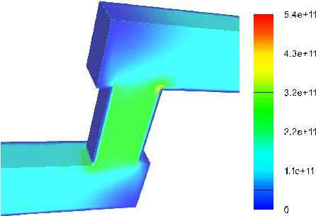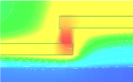Abbildung 7.15 zeigt die Stromdichte auf der Oberfläche der simulierten Struktur. Der hohe Widerstand der TiN-Barriere bewirkt eine fast gleichmäßige Verteilung der Stromdichte am Übergang zwischen unterem Leiter und Via. Die höchste Stromdichte kann man an der rechten Ecke im oberen Bereich des Vias erkennen. Dieser Bereich ist deshalb am meisten elektromigrationsgefährdet, da hier gleichzeitig auch erhöhte Temperatur auftritt. Allerdings wird die Stromdichte an dieser Stelle durch die Simulation etwas überschätzt, da bei üblichen Herstellungprozessen anstatt der hier angenommenen scharfen Kante eine Abrundung entsteht.