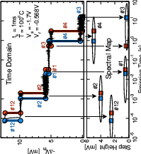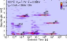 A further advance of the defect model was stimulated by experiments taken on small-area devices, where the recovery in response to NBT stress proceeds in discrete steps instead of a continuous curve [31]. The careful analysis of these steps led to the development of the time-dependent defect spectroscopy (TDDS) method [31, 32, 33], which makes a detailed investigation of the charging and discharging of single defects possible [32]. A typical TDDS spectral map is given in Fig. 1.6. The results of the TDDS experiments served as a testing ground of unprecedented detail for BTI models and allowed for the refinement of the physics in the two-stage model. The resulting multi-state defect model not only fits experimental data from BTI and TDDS experiments very well, it also links these phenomena to other phenomena such as random telegraph noise (RTN) and flicker noise [34, 35, 36, 32, 37].