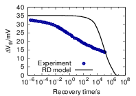 | Figure 1.4: | Typical recovery trace as predicted by the RD model for NBTI using equations (1.4)–(1.6), which is similar for all variants of the RD mechanism. The comparison with experimental data [12] shows that the RD predicted recovery occurs much too late and proceeds much too fast. |