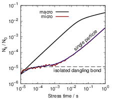 All in all, the macroscopic RD model can only be considered a valid approximation of the microscopic RD model for very long stress times and a sufficient amount of liberated hydrogen atoms. The time it takes for the macroscopic approximation to become valid, however, may exceed the time range in which it is usually applied, depending on the parametrization.