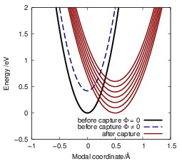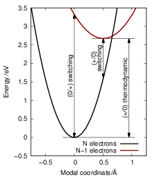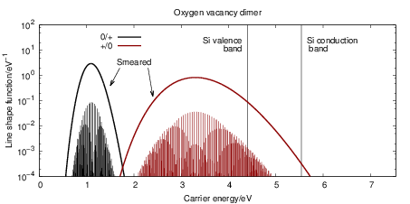 With respect to the modal spectrum, it is either assumed that the transition couples to an infinite number of phonon modes — all having the same oscillator strength — where each can contribute only one phonon [127, 202, 181], or that the transition couples to only one effective mode which receives or emits an arbitrary number of phonons [144, 117, 131]. Interestingly, for linear coupling modes both assumptions lead to essentially the same expression for the capture rates. For the situation we find in the bias temperature instability, in our opinion it is more reasonable to assume that the NMP kinetics are determined by a small number of local modes at the defect site. A coupling to a large number of modes does not seem reasonable for the defects involved in BTI and RTN considering the large variations in transition rates between the defects that are observed in measurements. These variations can only be explained by differences in the local environment of the defect structure which can only hold a small number of vibrational modes.