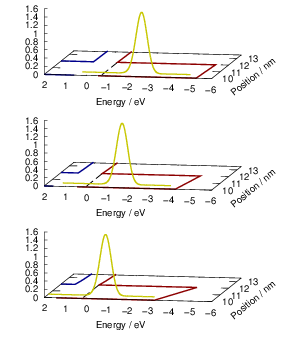 | Figure 4.28: | The spatially and energetically distributed hole density as calculated using the NEGF method. Thermal equilibrium in the gate and the silicon bulk is induced via an optical potential. The quantization of the hole states and their penetration into the oxide can be clearly seen. |