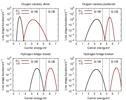 First, we investigate the effect of the bias induced shift of the relative positions of the line shape and the hole states. As mentioned in Sec. 4.4, this shift is especially relevant for the trapping behavior of oxide defects. Application of a gate voltage induces the largest electric field, and in consequence the largest band bending, in the oxide due to the absence of native carriers there. As illustrated in Fig. 4.29, the dependence of the line shape on the value of the reference energy at the defect site plays a crucial role for the transition kinetics, as the band bending energetically shifts the relative position of the line shape and the spectrum of the hole states, leading to large changes in the capture rate.