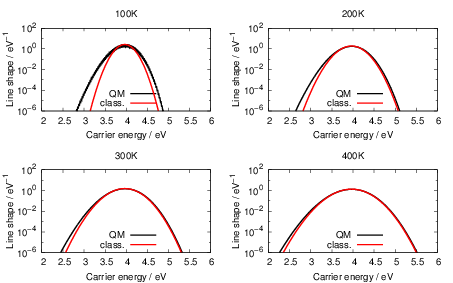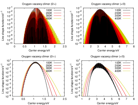 NMP defects show a strong temperature activation, in contrast to capture rates whose temperature dependence comes from the total carrier density alone, as in the SRH description. The calculated activation energies for the hole capture are in excellent agreement with the activation energies obtained from TDDS experiments in [32], which is again strongly influenced by the selected alignment scheme. The difference in temperature activation between line shapes calculated using the quantum mechanical formula of (4.68) and those calculated based on classical statistical physics (4.84) are also compared in Fig. 4.31. For the closed hydrogen bridge, this difference becomes visible only below 140K. For the puckered oxygen vacancy, the classical formula reproduces the quantum mechanical behavior over the complete temperature range investigated. Again, we take this as an indication that the quantum mechanical effects of the nuclei are negligible for the calculation of rates of typical BTI experiments.