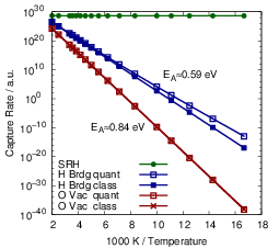 | Figure 4.31: | Arrhenius plots of the capture rates for the defect types comparing the quantum mechanical NMP capture rates (4.68) for the puckered oxygen vacancy and the closed hydrogen bridge to the capture rates calculated using classical atoms (4.84) and to a SRH like model. The indicated activation energies are obtained by fitting to an Arrhenius law. |