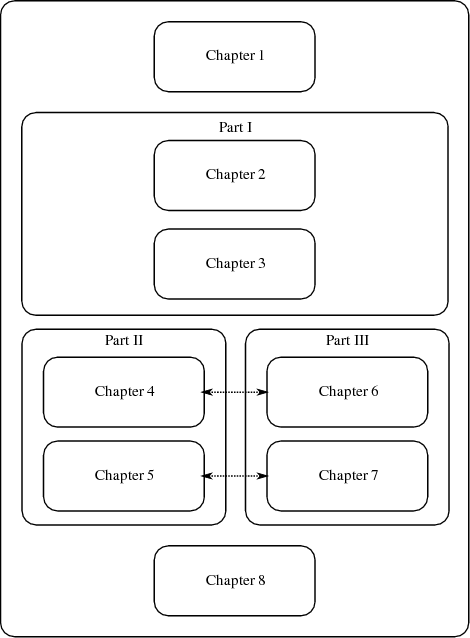 The main bulk of this document is split into two dual parts. While the two parts are distinct, they are linked to one another by being designed to mirror each other regarding topics and concepts of the contained Chapters.