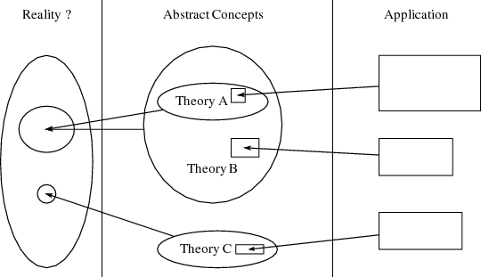 Figure 2.2 is an illustration of how theories, based on abstract concepts attempt to map out the elusive thing we call reality, are used for applications. Several different theories may attempt to explain the same aspect of reality, but one is a subset of the other. Examples for such a case are classical mechanics (e.g., theory A in Figure 2.2) and quantum mechanics (e.g., theory B in Figure 2.2), where classical mechanics appears as a subset of quantum mechanics. Many important applications, as simple as levers or as complex as clockworks, have been realized using purely the theory of classical mechanics, without the need for quantum mechanics. By utilizing quantum mechanics new applications, such as in the field of solid state physics or lasers become feasible, which would not fit into the setting of classical mechanics. It is important to note, however that different theories do not need to be compatible with one another, such as is the case with quantum mechanics and general relativity (e.g., theory C in Figure 2.2). Thus, abstractions should be seen as important and powerful tools, which can be used to realize various applications, without being able to claim to provide a comprehensive model of reality.
