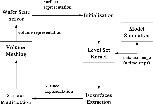WSS is a program library and file format for handling three-dimensional objects in semiconductor process simulations developed at our institute [14]. It is a solution for the integrated simulation of three-dimensional manufacturing processes. A generic data model suitable for process and device simulations allows an efficient data exchange between simulators even when they are based on different native file formats. It is also able to handle different meshes and distributed quantities stored thereon. The program library also defines algorithms to perform geometrical operations for fully three-dimensional process simulations as they are used in topography simulations.