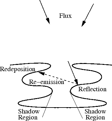The local fluxes and etch or deposition reactions provide sufficient information on how the surface is to be deformed for a short time step. The time evolution of the profile requires many time increments which allow the change of the profile shape to influence its future shape through shadowing, etc. As the surface evolves there may be major topological changes. For example, outgrows of the material from sides of a trench might collide and close off a void, or etch fronts from two trenches might move laterally, collide and form a tunnel or an air bridge.