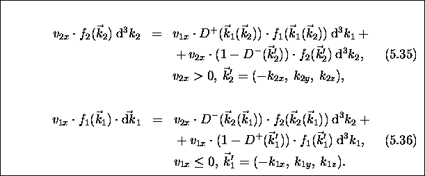 Mit diesen Erhaltungsgleichungen können nun die Grenzflächenbedingungen für die Impulse spezifiziert werden. Um die Teilchenerhaltung innerhalb eines Teilgebiets zu gewährleisten, muß die Anzahl der Elektronen, die die Grenzfläche erreichen, mit der Anzahl der Elektronen, die die Grenzfläche verlassen, übereinstimmen. Wie in [28] beschrieben, definieren die Elektronen, die in ein Teilgebiet eindringen, die Grenzflächenbedingungen. Dies bedeutet, daß für jedes Teilgebiet eine Bedingung und damit für die Grenzfläche zwei Bedingungen spezifiziert werden.